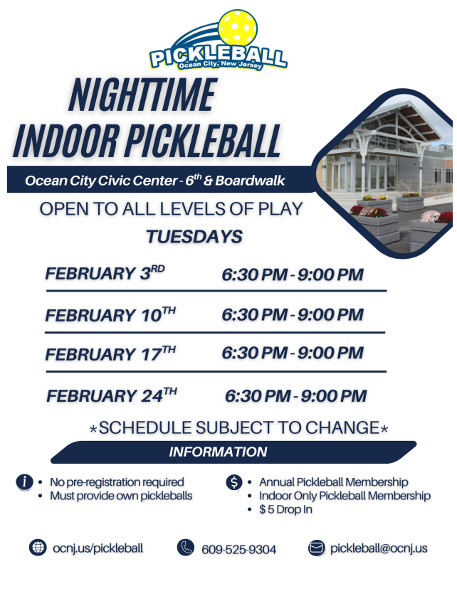 Courts only open during hours listed on flyer. Trouble viewing flyer? Click here: 2025-2026 Indoor Pickleball Flyer - White.pdf