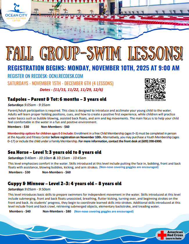 All activities are handled on a first come, first serve basis for residents and seasonal vacationers. The Ocean City Community Services Department and the Division of Recreation Programs reserves the right to cancel or make changes to any program due to lack of registration, inclement weather or reasons beyond the department’s control. Programs, dates and times are subject to change due to availability of facilities. Registration will only be accepted from a parent or legal guardian over the age of 18.