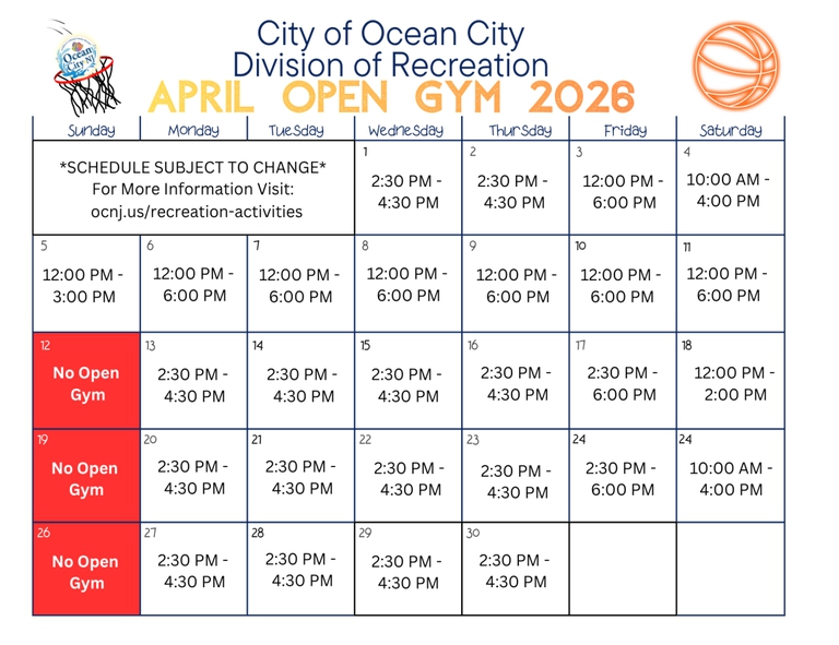 A Open Gym takes place at the Ocean City Civic Center (6th & Boardwalk) unless otherwise noted